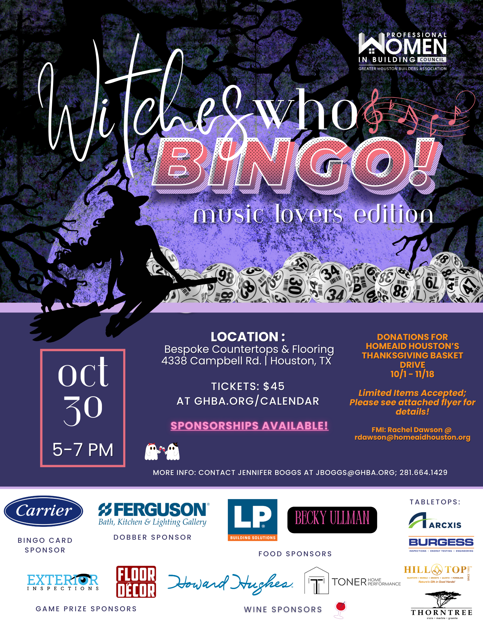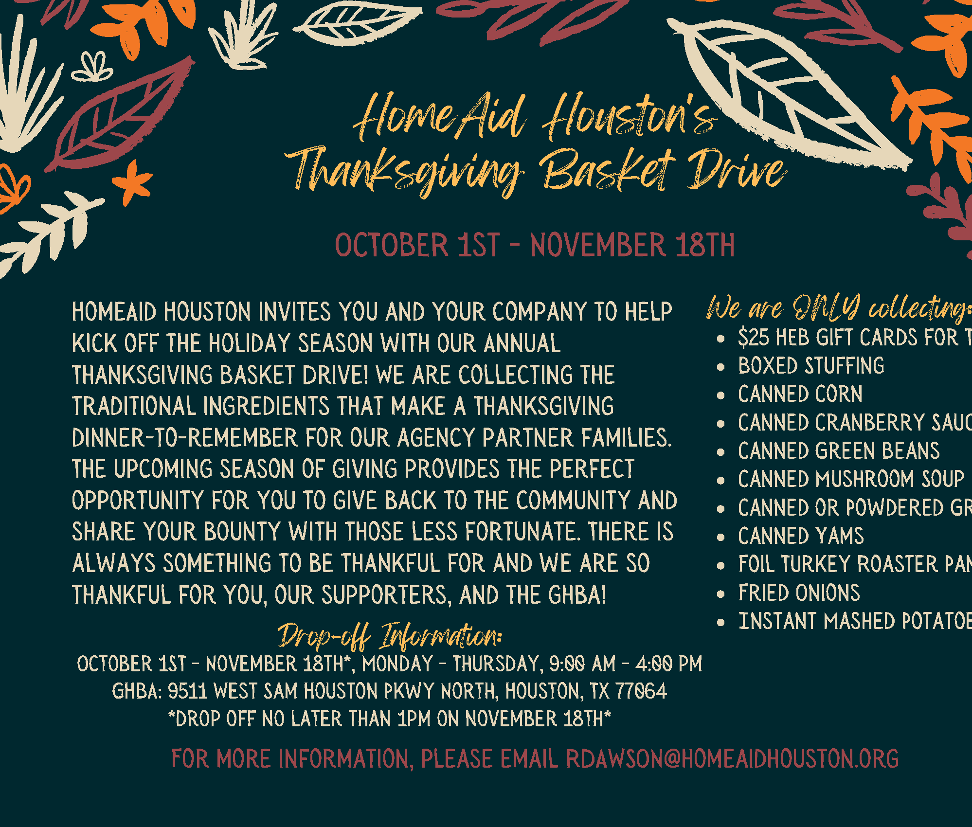 We are also taking donations for HomeAid Houston's Thanksgiving Basket Drive! Bring your donations to the event or pick up a basket for your office to collect donation. Please see flyer below. They ONLY collecting the following items: