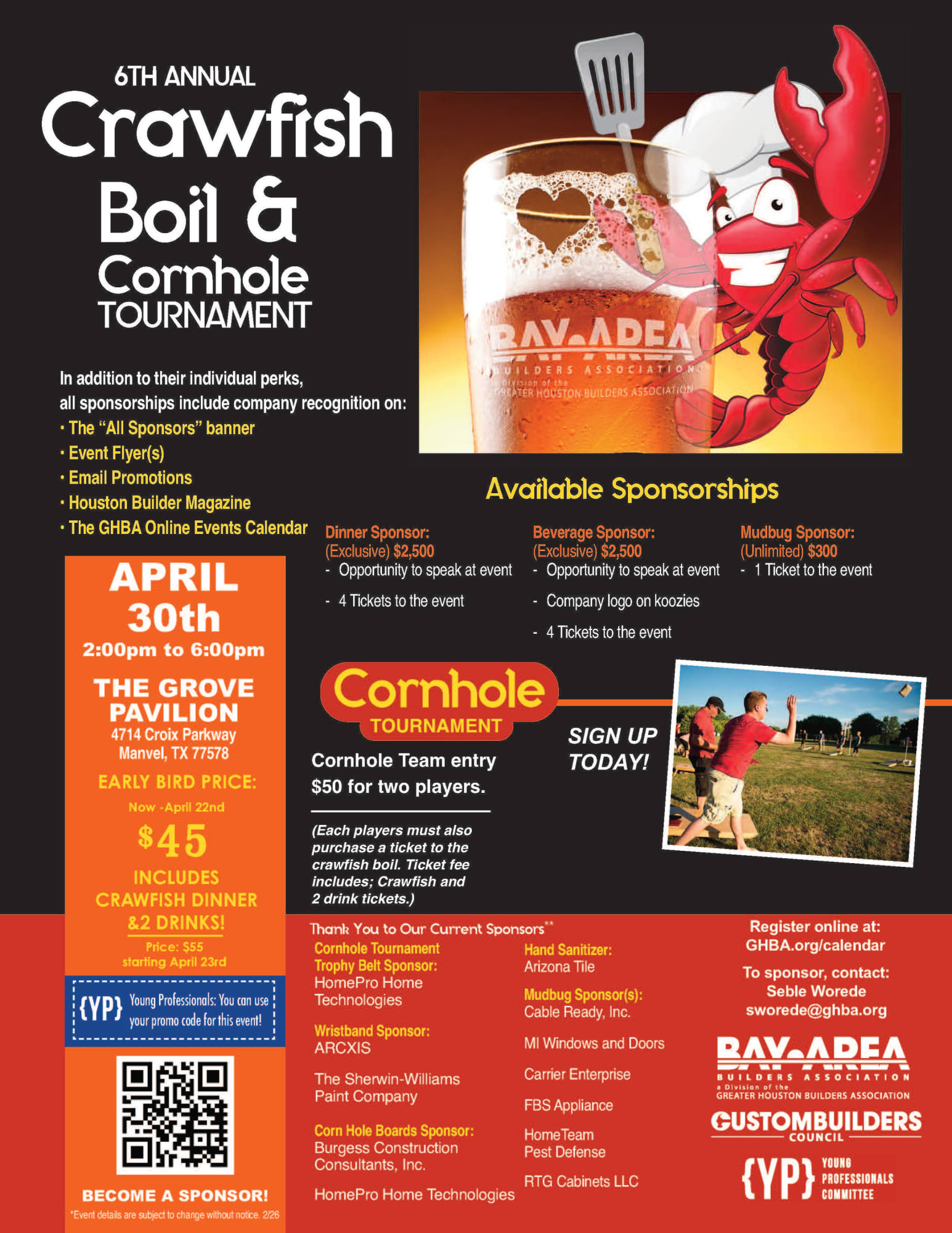 Join us at the Grove Pavilion for the Annual Bay Area Builders Association Crawfish Boil and Cornhole Tournament with Custom Builders Council and Young Professionals Committee!