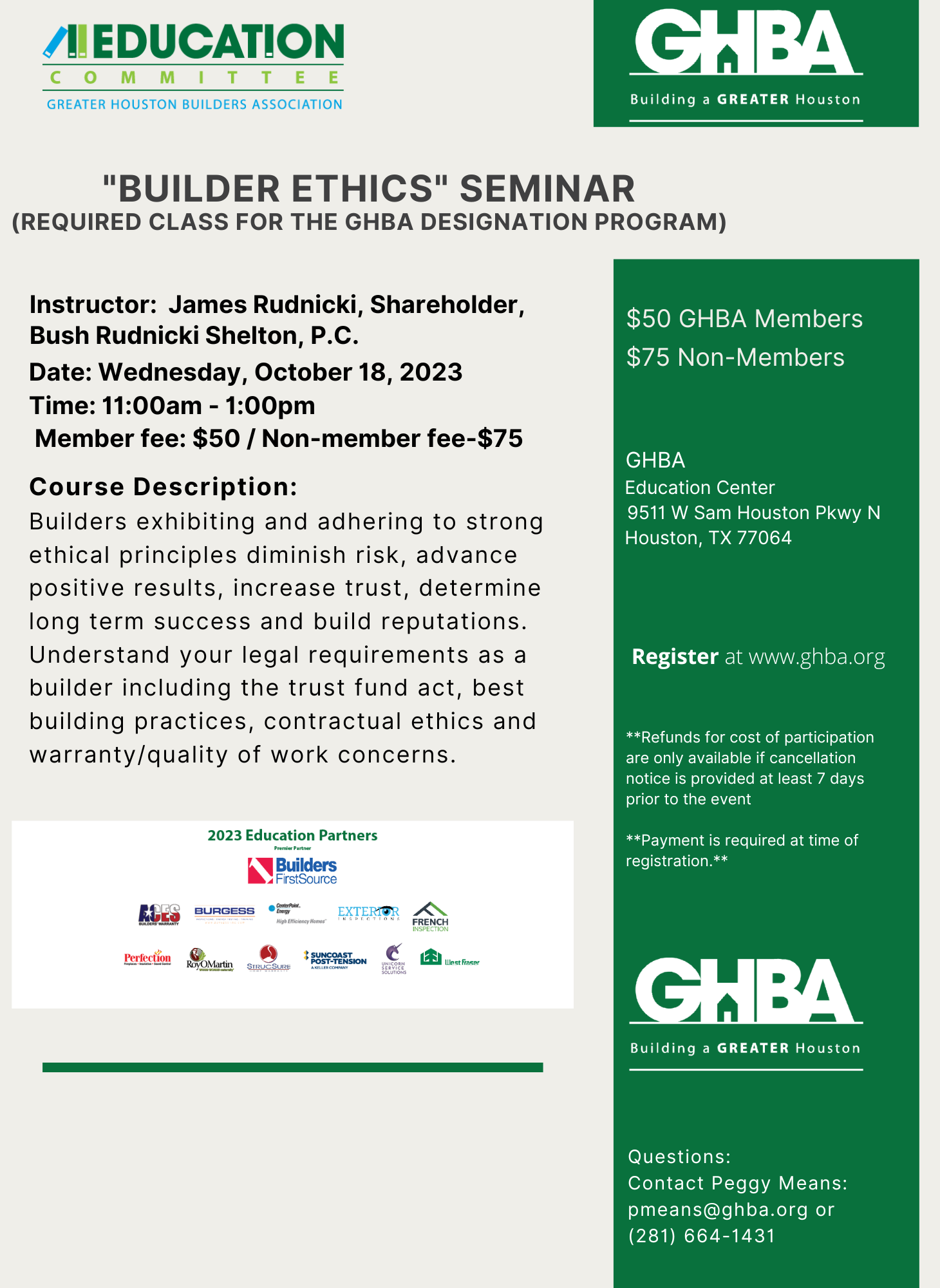 Title: Builder Ethics Seminar (Required class for the GHBA Designation Program)Date: Wednesday, 10/18/23