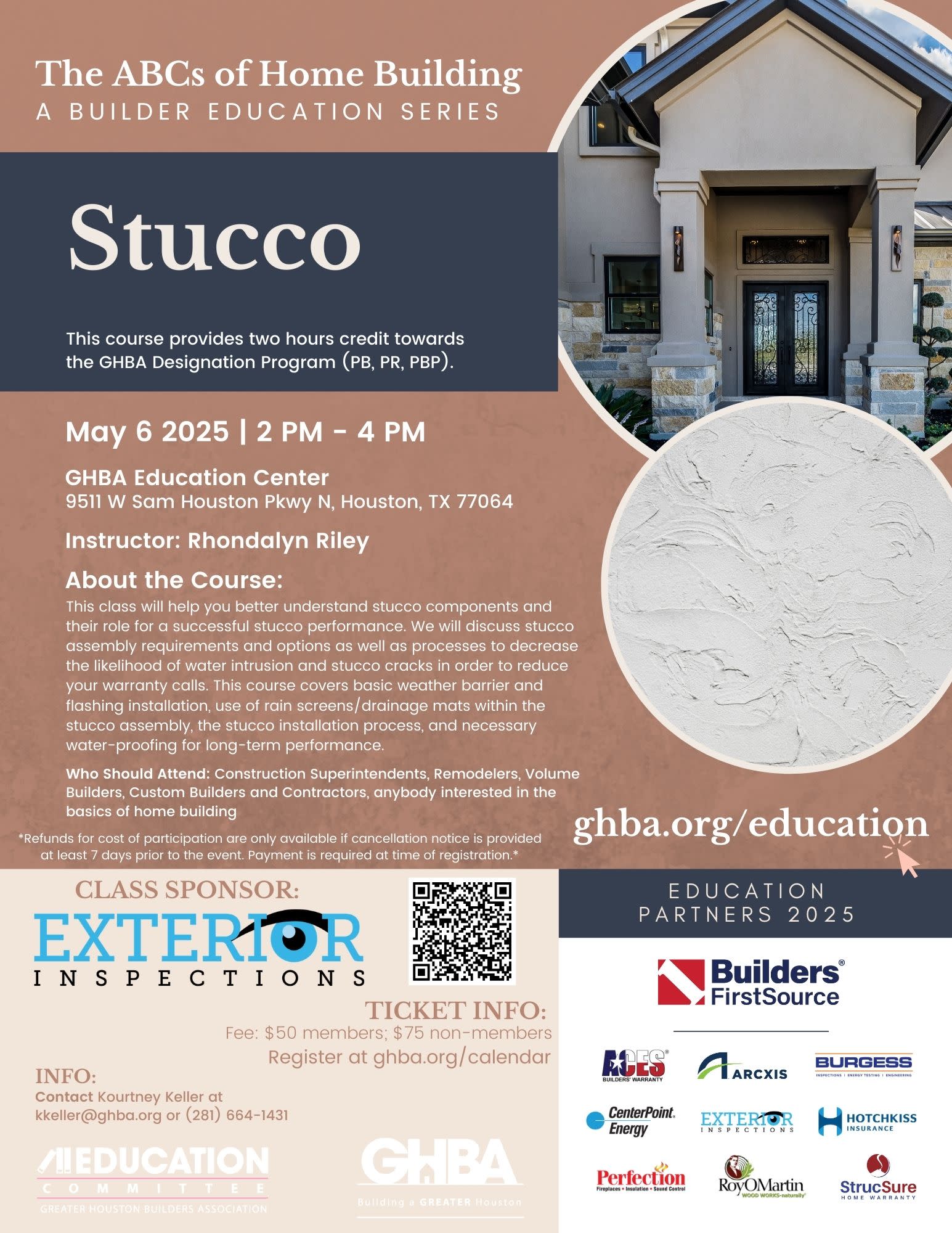 This class will help you better understand stucco components and their role for a successful stucco performance. We will discuss stucco assembly requirements and options as well as processes to decrease the likelihood of water intrusion and stucco cracks in order to reduce your warranty calls. This course covers basic weather barrier and flashing installation, use of rain screens/drainage mats within the stucco assembly, the stucco installation process, and necessary water-proofing for long-term performance.