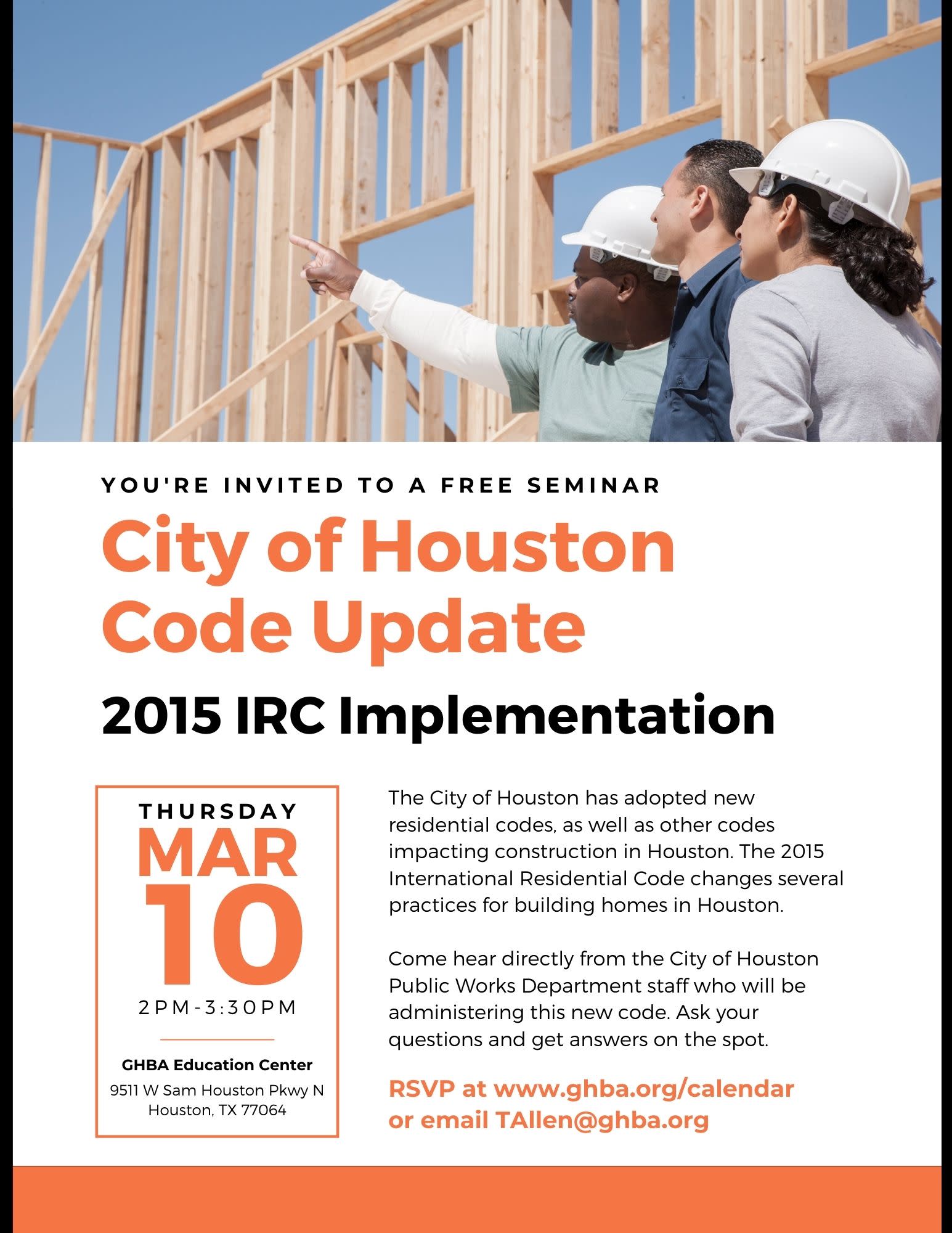The City of Houston has adopted new residential codes, as well as other codes impacting construction in Houston. The 2015 International Residential Code changes several practices for building homes in Houston. Come hear directly from the City of Houston Public Works Department staff who will be administering this new code. Ask your questions and get answers on the spot.