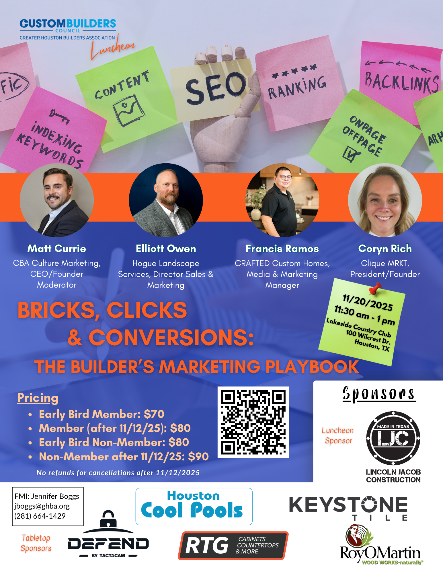 Marketing for a custom builder can be particularly challenging. How do you create visibility to the specific clients you are hoping to attract? With AI on the rise, the keyboard and mouse have become as important as the hammer and nail in growing your custom homebuilding business. Come join your fellow CBC members for our last luncheon of the year and learn more about new trends in digital marketing and how to build and use your digital toolbox to reach your next level of business growth!