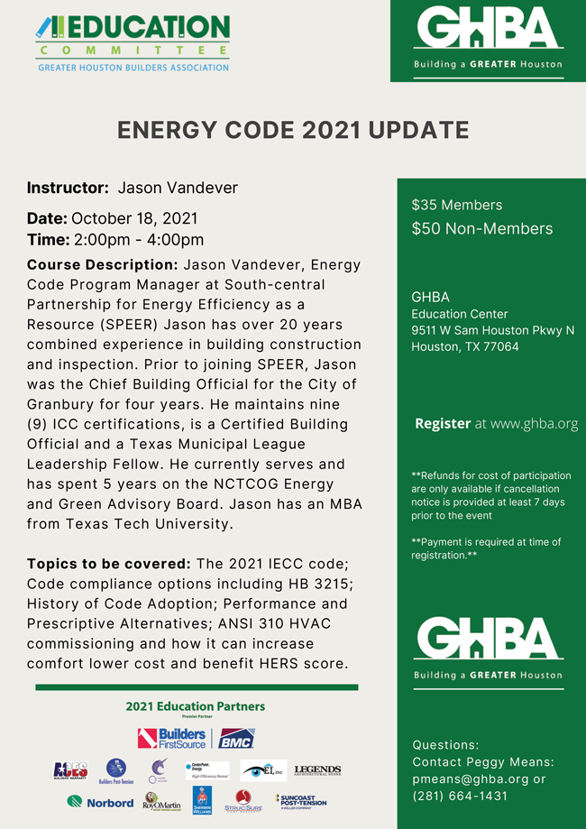 This two part seminar will also feature a panelist of experts on the following topics: HB3215 by Kathy Howard, Burgess Consultants; CBGC Summary Clayton Farmer Bluegill; ANSI 310 Benefits Mark Curry, Topbuild; ANSI 310 Summary by James Rodriquez, Fox Energy Specialist; Top 5 Energy Efficient Issues and solutions by Brannon King, DPIS Builder Services.