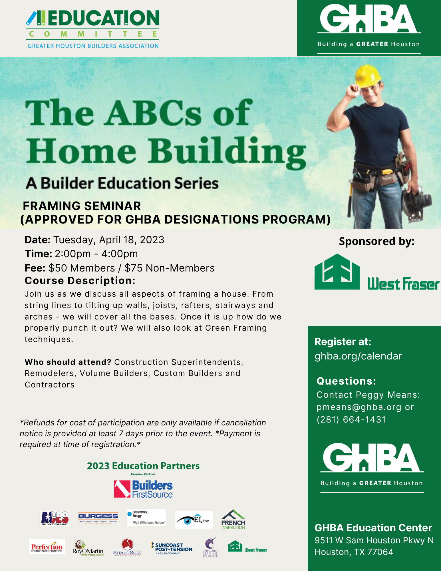 Framing Seminar - ABC's of Home Building Series (APPROVED for GHBA Designations Program)