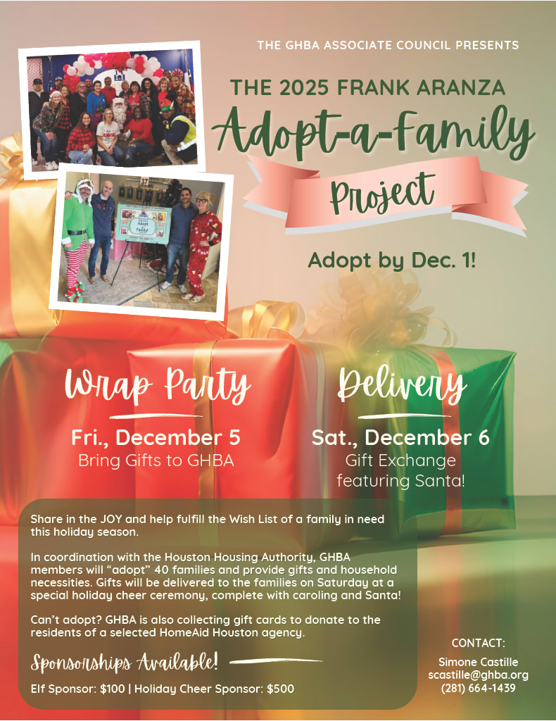 Can't adopt an entire family? GHBA is also accepting gift cards in the amount of $25 to be donated to a HomeAid agency. Email Simone Castille to adopt a family at: scastille@ghba.org