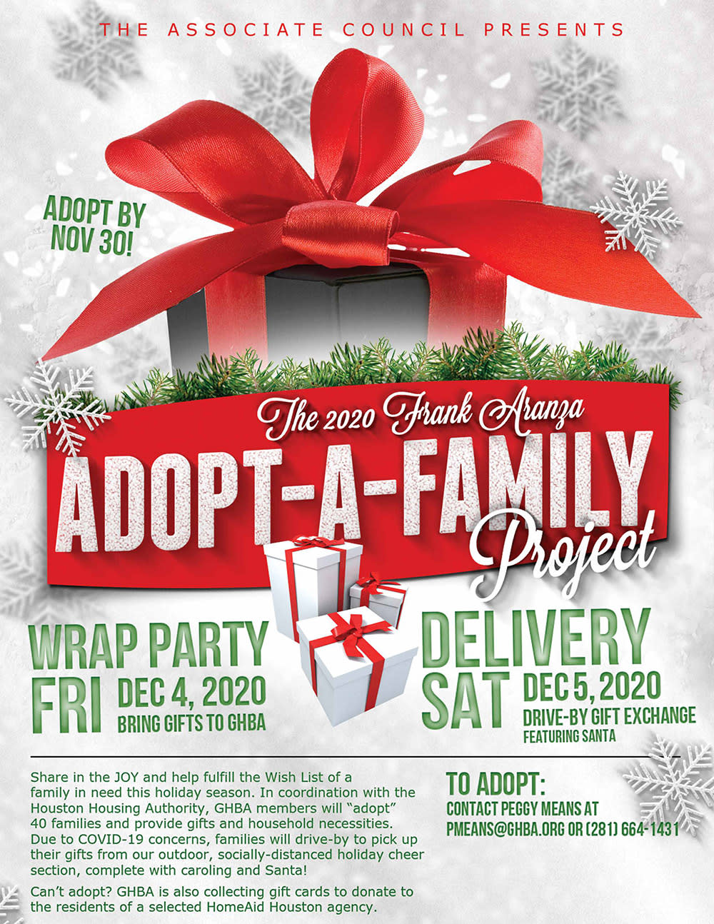 Share in the joy and spread holiday cheer! Adopt a family by Nov. 30. Can't adopt an entire family? GHBA is also accepting gift cards in the amount of $25 to be donated to a HomeAid agency. Email Peggy Means to adopt a family at: pmeans@ghba.org