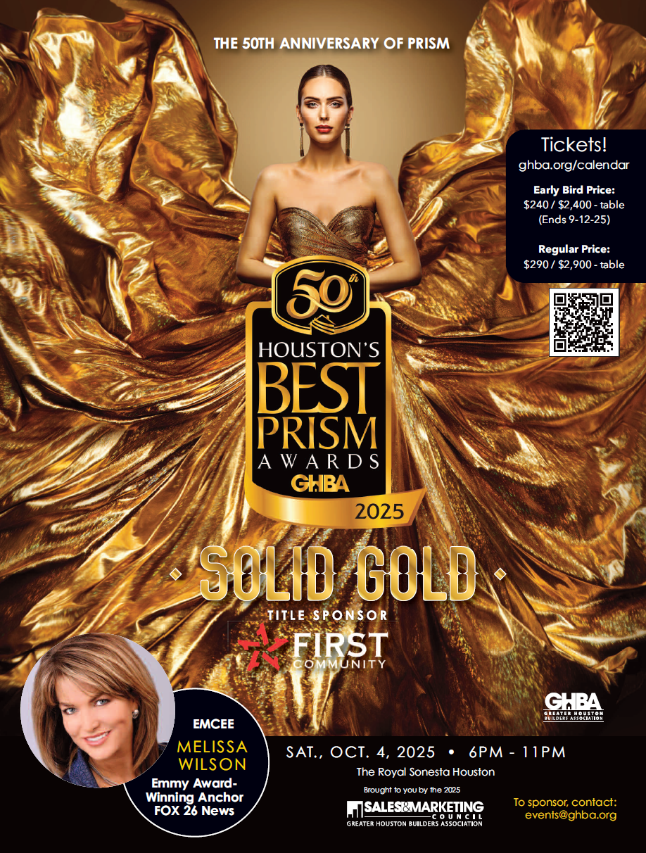 Join us for an unforgettable evening at the Houston’s Best PRISM Awards, the premier awards gala hosted by the GHBA’s Sales & Marketing Council. Now in its 50th year, this prestigious event honors the outstanding achievements of Houston’s Best Builders, Remodelers, and Developers, as judged by industry leaders from across the country.