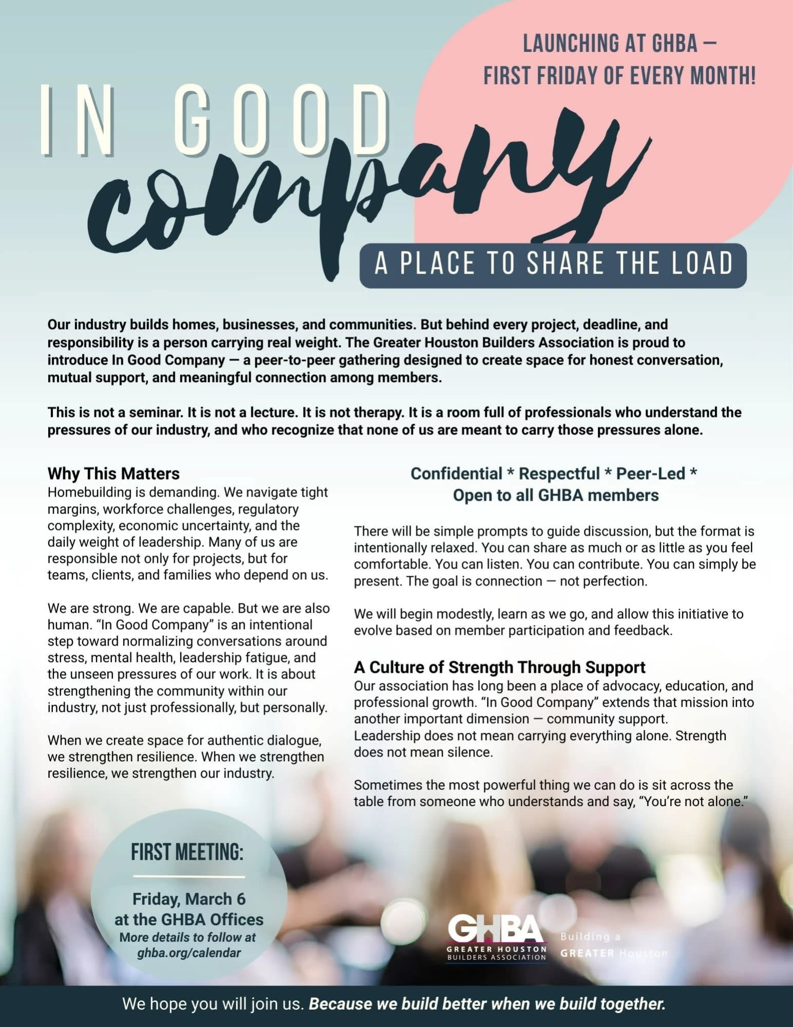 Our industry builds homes, businesses, and communities. But behind every project, deadline, and responsibility is a person carrying real weight. The Greater Houston Builders Association is proud to introduce In Good Company — a peer-to-peer gathering designed to create space for honest conversation, mutual support, and meaningful connection among members. This is not a seminar. It is not a lecture. It is not therapy. It is a room full of professionals who understand the pressures of our industry — and who recognize that none of us are meant to carry those pressures alone.