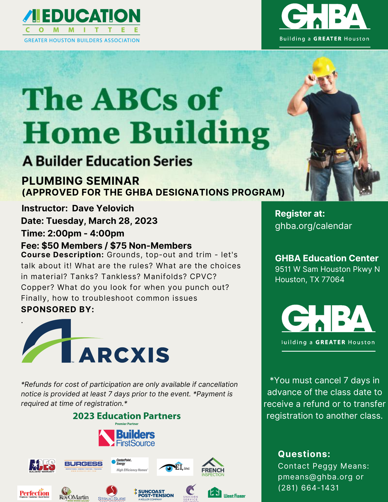 Plumbing Seminar (ABC's of Home Building Series & Approved for GHBA Designations Program)