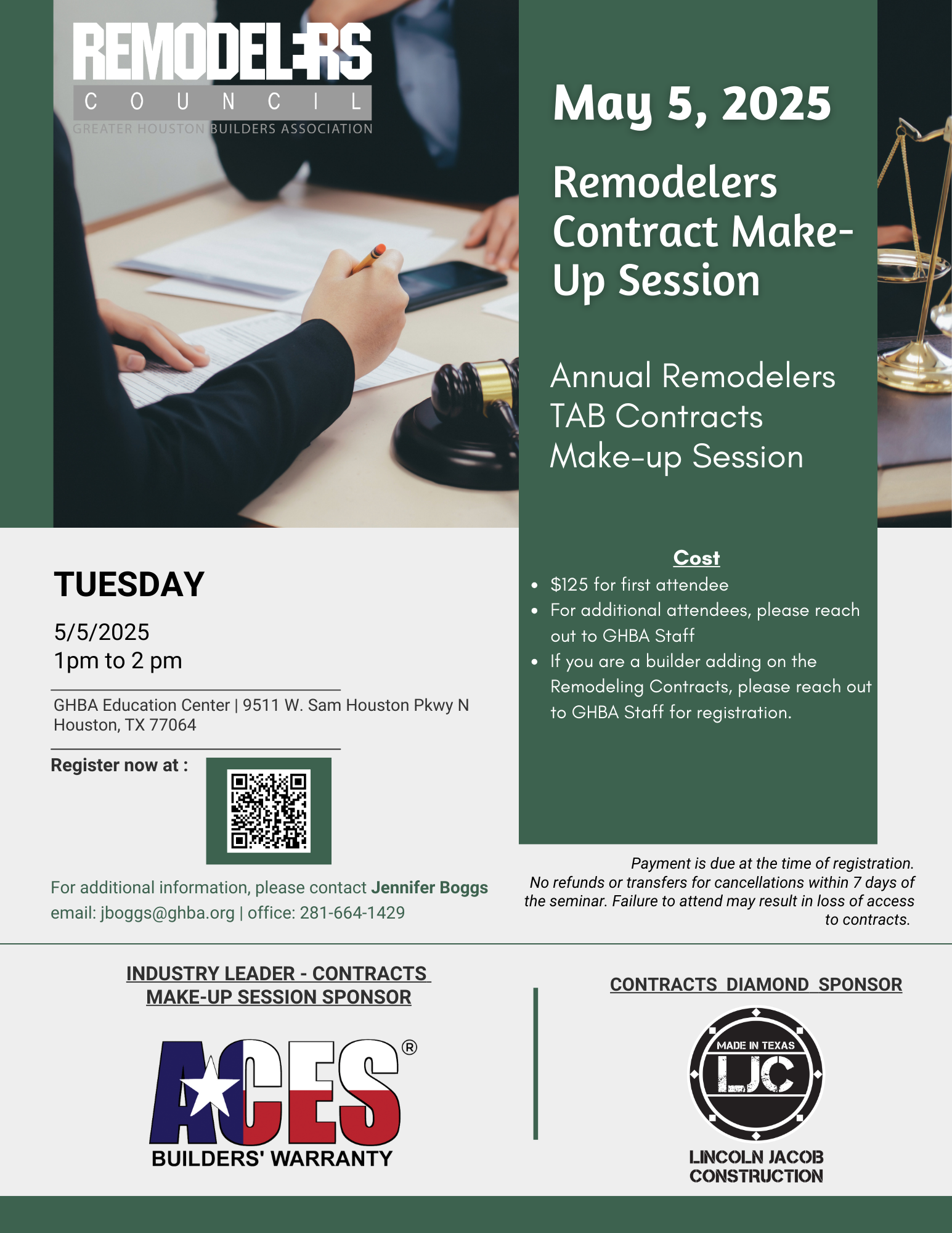 This seminar is for GHBA members who use the TAB Contracts. If you missed the required Annual Contracts Seminar in October, please register here!