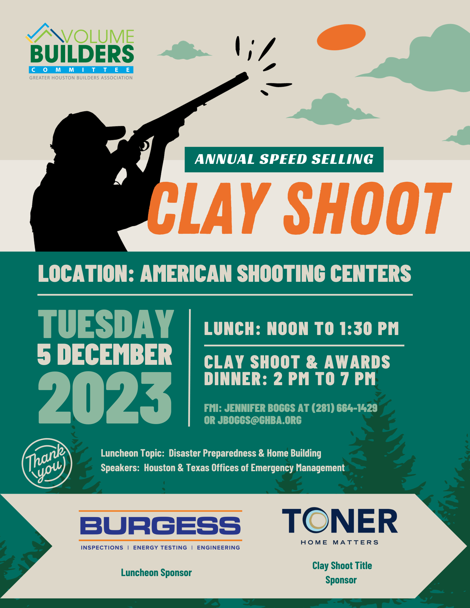 Volume Builders! Mark your calendars for GHBA's Annual Volume Builders Committee Speed Selling Clay Shoot! For luncheon registration (open to GHBA Builders Only), please reach out to GHBA Staff.